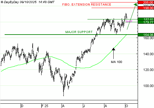 NVIDIA est dans une tendance haussière de long terme, qui a été interrompue en fin d’été par une consolidation sous une résistance à 183,6 dollars. Ce seuil a été franchi la semaine dernière, ce qui confirme la tendance haussière. Le repli actuel va trouver un support entre le précédent sommet et le gap haussier ouvert il y a peu, à 179,77 dollars. Les objectifs suivants sont à 198 puis 205 dollars.