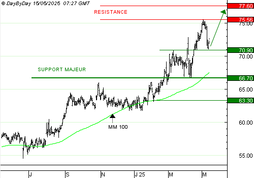 Cette tendance haussière serait invalidée par la rupture du support majeur à 66,7 euros.
