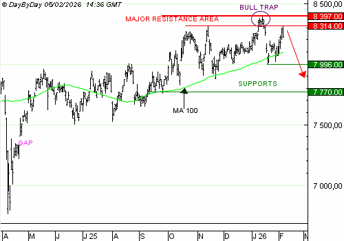 Le franchissement de la résistance à 8 397 points invaliderait ce développement baissier à court terme.