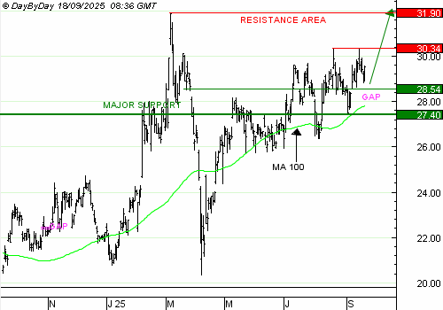 La rupture du dernier creux, à 27,4 euros, invaliderait cette tendance haussière.