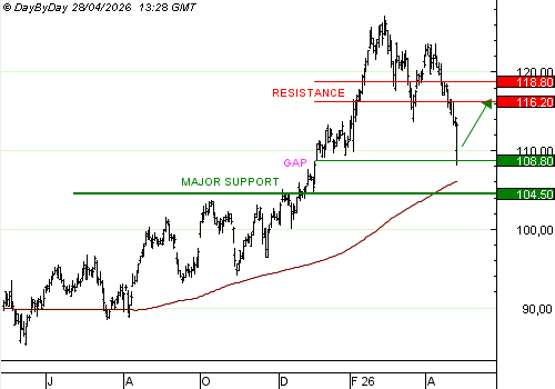 NOVARTIS avait atteint un sommet juste avant la déclaration de la guerre en Iran. Depuis, le titre s’est replié, accélérant à la baisse aujourd’hui alors que ses ventes déçoivent les investisseurs. Cette nouvelle permet de tester le gap haussier ouvert en janvier, et le bas d’une zone de consolidation de la même époque, à 108,8 CHF. C’est l’occasion d’un rebond vers les résistances à 116,2 CHF, voire 118,8 CHF. Cette reprise haussière serait invalidée par la rupture du support majeur à 104,5 CHF.