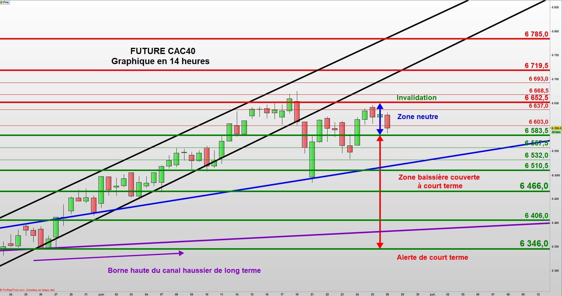 Ceci nous pousse à élargir légèrement, notre zone de neutralité, pour la séance du 29 juin. Elle se situe donc, entre l’ancienne borne haute d’un précédent biseau (en bleu) à 6524 et la résistance majeure à 6652,5.