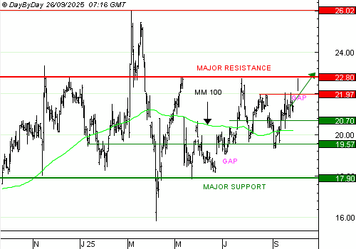 ALSTOM évolue dans une large zone de consolidation entre 17,9 euros et 22,8 euros depuis novembre 2024. Le titre a fait deux excès de part et d’autre de cette zone, mais brefs. Il revient sur le haut de cet espace en ouvrant un gap haussier. Nous proposons de solder la totalité de la position, le titre étant très lent, et le KO du produit remontant avec le temps.