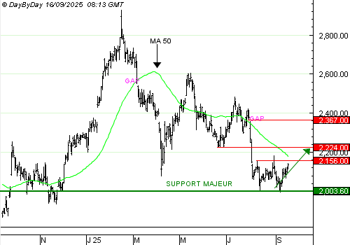 Hermès rebondit pour la deuxième fois depuis son support majeur à 2003,6 euros et approche de la première résistance à 2 156 euros. S'il est franchi, ce seuil créera une accélération haussière qui pourrait mener au-delà de notre résistance à 2 224 euros. Pour le moment, le titre arrive sur la résistance qui a déjà interrompu la hausse à deux reprises, et nous proposons donc une prise de profits partielle.