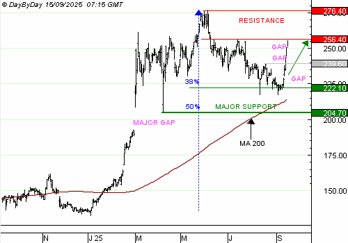 Thalès accélère à la hausse depuis le retracement de 38 % de la hausse de 2025. Le titre a déjà ouvert trois gaps haussiers successifs en quelques jours. Il a presque atteint notre deuxième objectif à 256,4 euros. Nous proposons de solder cette position.