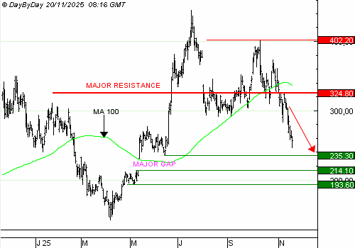 Le Turbo infini Best PUT COINBASE WE86V, ISIN DE000VH7YH36, peut être vendu à 0,65 euro, générant un petit gain de +14 %. Le reste de la position peut attendre une reprise du mouvement vers le bas du gap à 214,1 dollars.