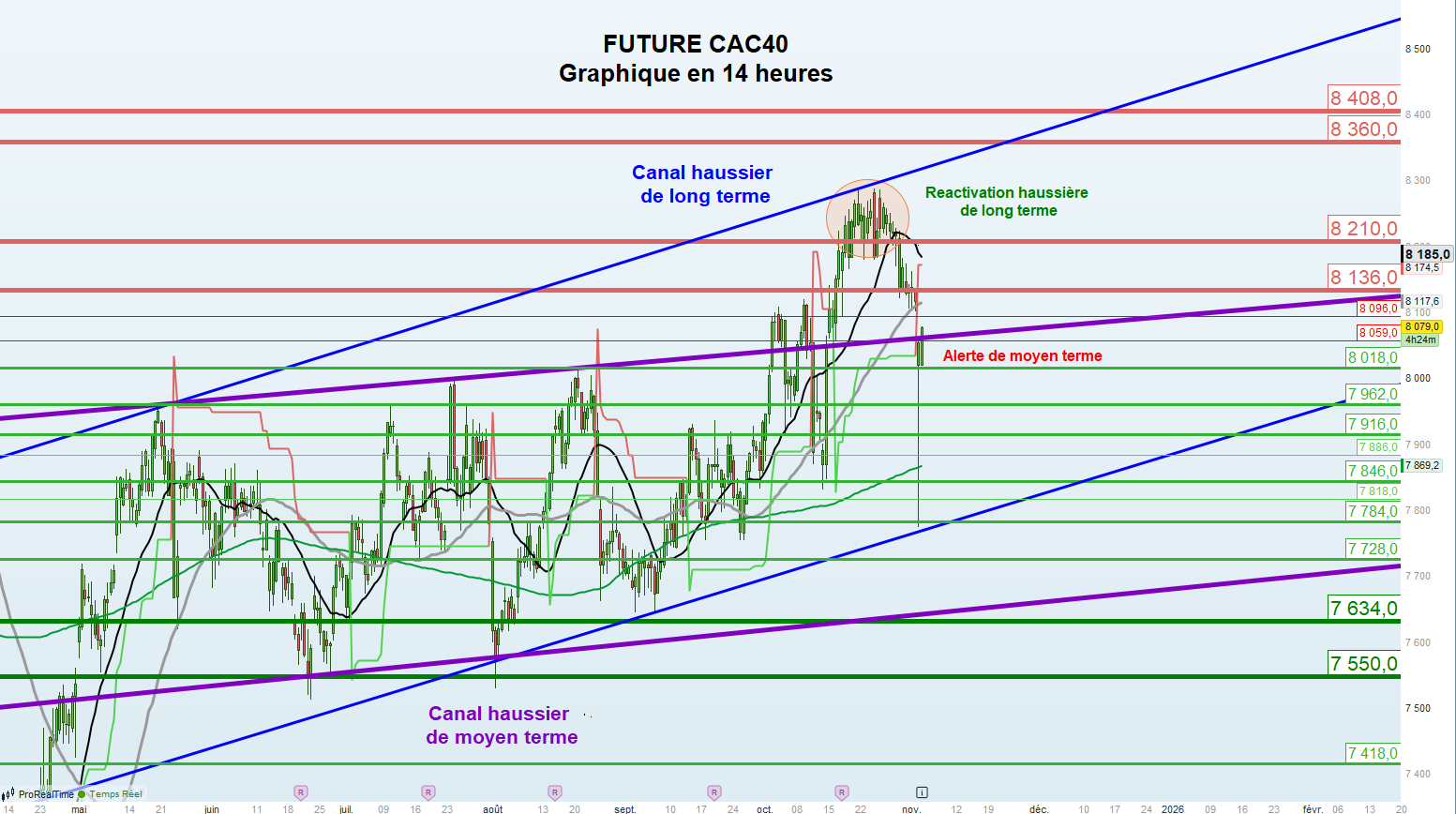 À l’inverse, une clôture au-dessus de la borne haute du canal haussier de moyen terme, accompagnée d’un comblement du gap à 8 104,5 points, marquerait un coup d’arrêt au mouvement de consolidation initié depuis le test des 8 290 points. Un franchissement de la résistance majeure située à 8 136 points confirmerait le rebond et réactiverait la dynamique haussière de court terme, avec pour cible les 8 320 points, niveau correspondant à la borne haute du canal haussier de long terme.