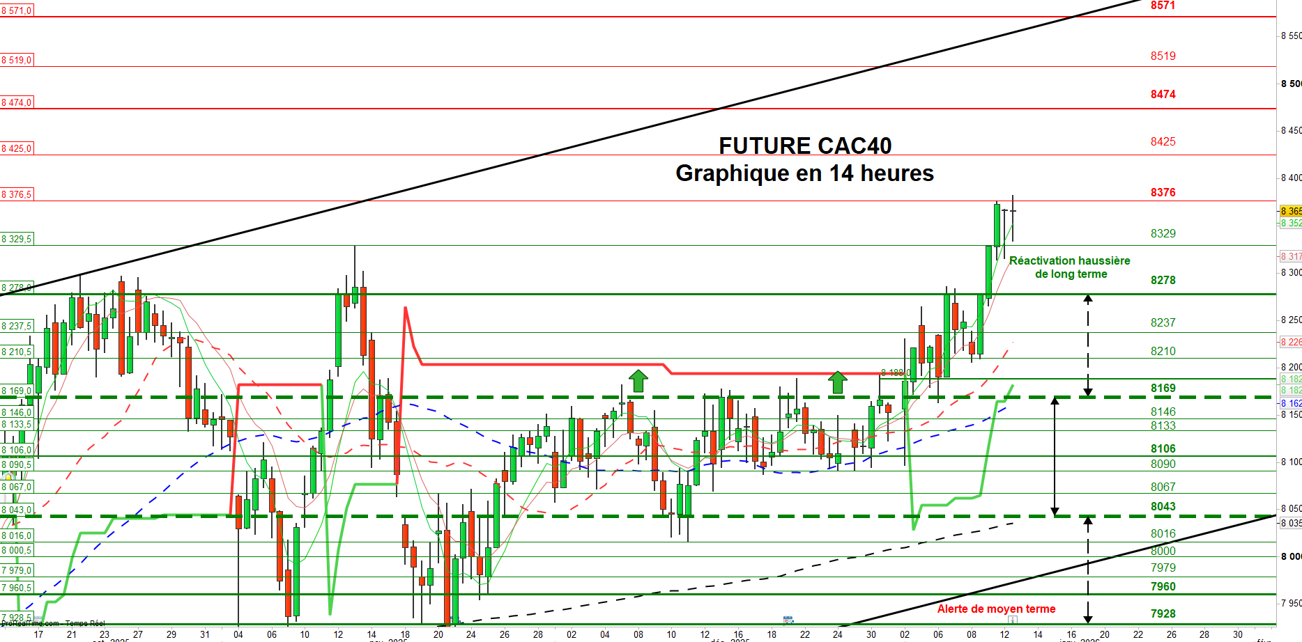 À l’inverse, un retour sous 8329 points affaiblirait la dynamique actuelle, en particulier s’il s’accompagnait d’une cassure de la zone de réactivation haussière de long terme située à 8278 points, récemment franchie.
