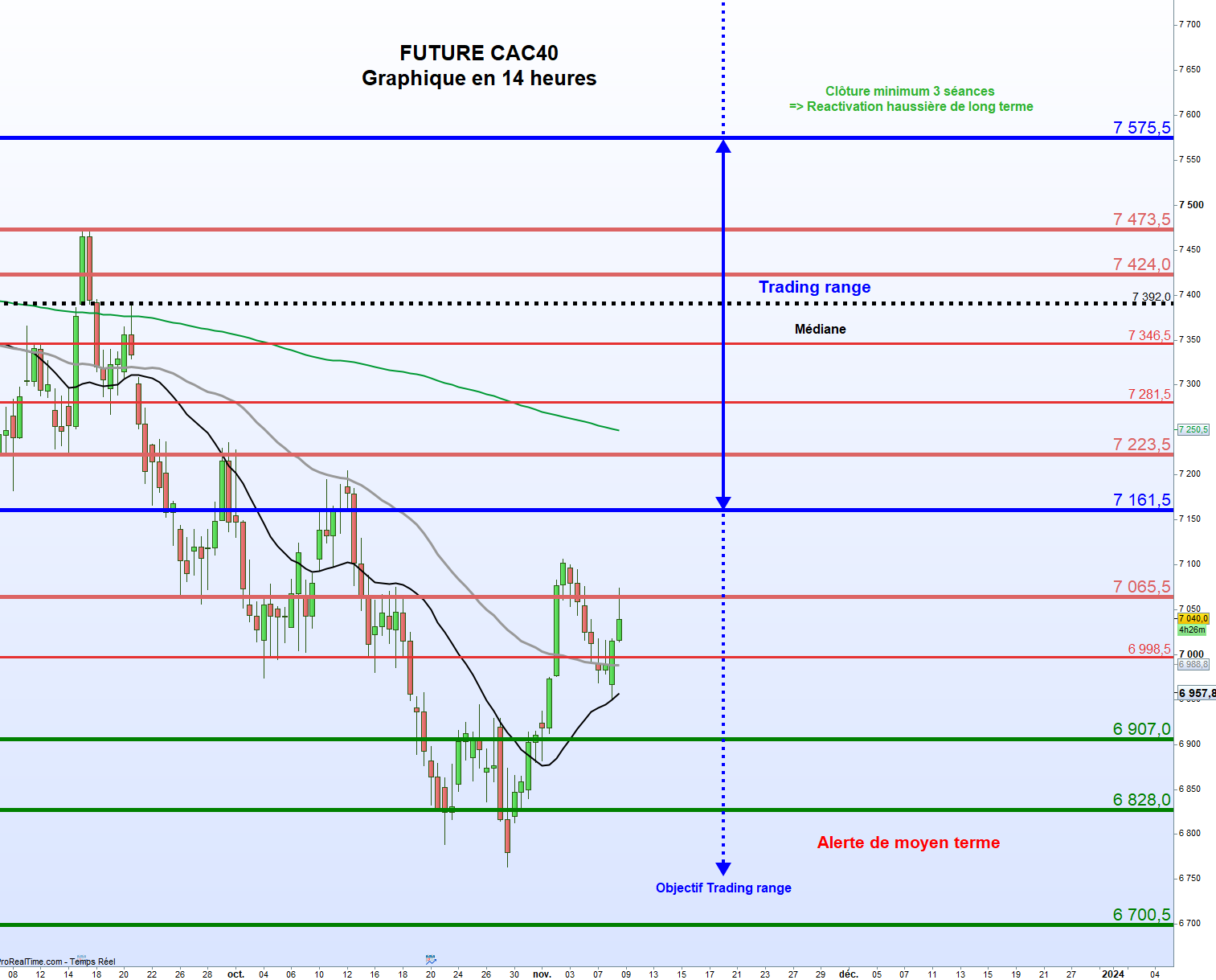Graphiquement, le Future CAC40 (Cf. graphique joint en 14 Heures), a tenté de mettre fin au mouvement de consolidation de court terme initié depuis le 3 novembre après avoir amorcé un rebond de plus de 5%. Un débordement en clôture de la résistance majeure située à 7065,5 points, serait le signe précurseur d’une poursuite du rebond mais ce n’est qu’une réintégration du trading range dont les borne étaient situées entre 7161,5 et 7575,5 qui marquerait la fin de cette consolidation. Une clôture au sein de cette zone de neutralité de long terme, réactiverait la dynamique haussière moyen terme avec pour 1ère cible, sa médiane positionnée à 7392 points et avec pour 2ème cible, la partie haute de cette zone de congestion. Un débordement, de ce palier de réactivation haussière de long terme aurait pour objectif 7990 points, une cible obtenue en répliquant la hauteur du trading range.