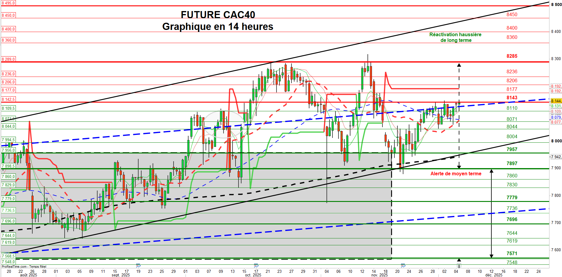 À l’inverse, un repli sous les moyennes mobiles 50 et 20 en 14 heures, situées respectivement à 8079 et 8064 points, affaiblirait nettement le rebond actuel. Une telle configuration augmenterait le risque de baisse et pourrait favoriser un retour vers les zones de 8004 puis 7957 points.