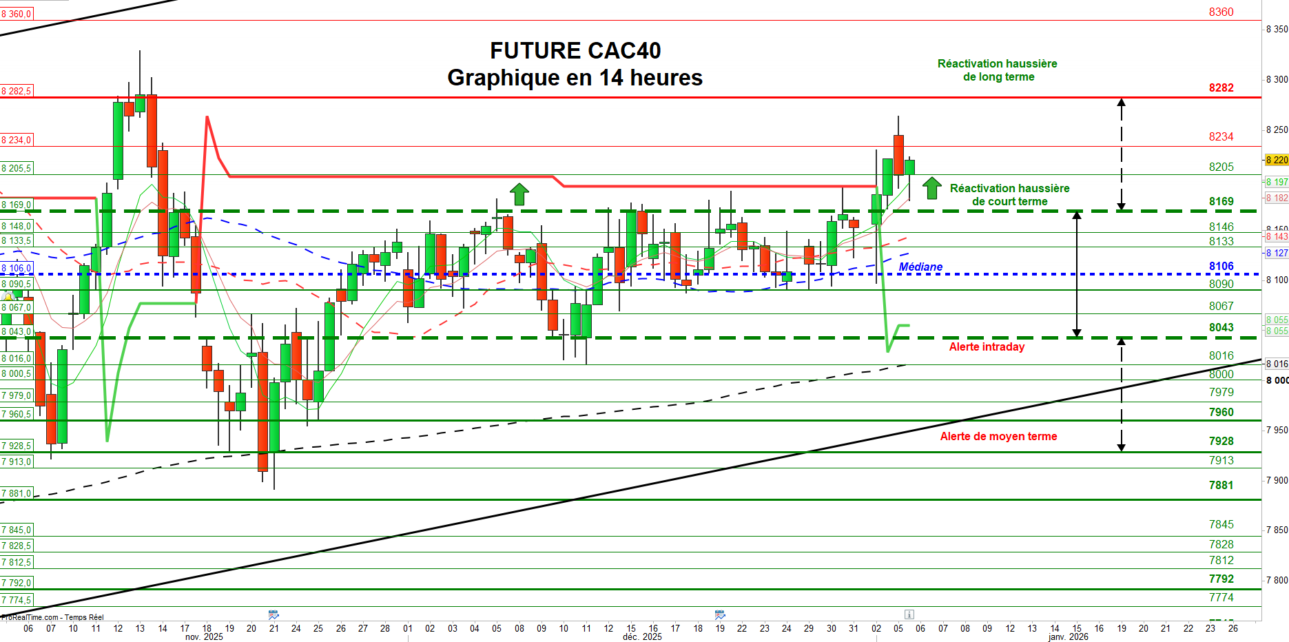 À l’inverse, une réintégration durable de la zone de consolidation comprise entre 8169 et 8043 points fragiliserait la structure technique actuelle et pourrait remettre en question la dynamique positive observée ces derniers jours. Dans ce scénario, l’indice serait susceptible de revenir vers la zone médiane du trading range, située autour de 8106 points. La rupture de cet axe d’équilibre renforcerait alors la pression vendeuse et pourrait entraîner un repli plus marqué en direction de la zone d’alerte intraday identifiée à 8043 points.