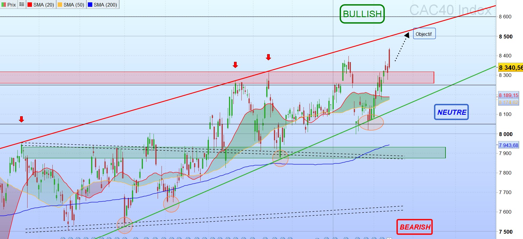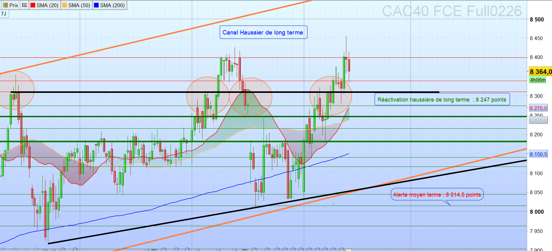 En intraday, le biais est haussier au-dessus de sous 8358 points.