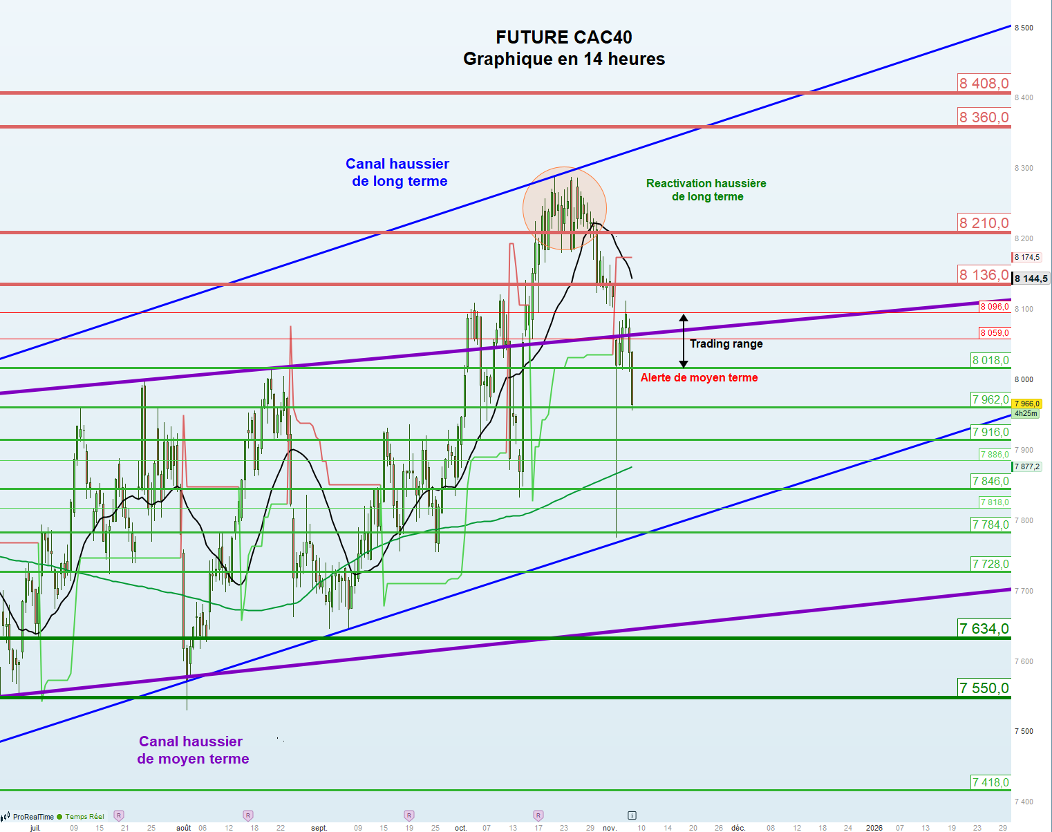 À contrario, une clôture au‑dessus de 8 065 points témoignerait de la résilience du marché et de sa volonté d’éviter une consolidation plus marquée, scénario qui serait confirmé en cas de sortie par le haut de la zone de congestion. Un franchissement de la résistance majeure, positionnée à 8 136 points, relancerait la dynamique haussière de court terme, avec en ligne de mire les plus hauts historiques, suivi d’une extension possible vers 8 326 points. Un dépassement durable de ces niveaux, en force et en clôture sur au moins trois séances, invaliderait le triple top hebdomadaire et réactiverait la dynamique haussière de long terme, en direction de 9 364 points, cible finale.