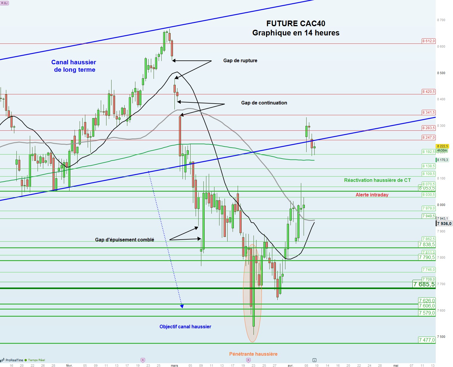 Graphiquement, le Future CAC 40 (cf. graphique en données 14 heures) a évolué autour de la partie inférieure du canal haussier de long terme, récemment réintégré suite au gap haussier observé lors de la séance du 8 avril. Une phase de consolidation supplémentaire, visant le niveau de réactivation à 8 053,5 points, suivie d'une extension en direction du gap à 8 029 points, signalerait une dégradation du sentiment de marché, indiquant une perte de momentum haussier et une prise de profit par les investisseurs. Toutefois, un rebond rapide préservant ce seuil ne remettrait pas en question la tendance haussière de court terme, tandis qu'une rupture décisive de ce niveau pivot entraînerait un retour marqué vers le support majeur à 7 685,5 points. Une nouvelle incursion dans la zone 7 685,5/7 477 points serait tolérée, mais une clôture sous ce niveau invaliderait le rebond amorcé le 23 mars et conduirait à une reprise baissière notable, en direction de la ligne de cou du triple top à 7 092,5 points.