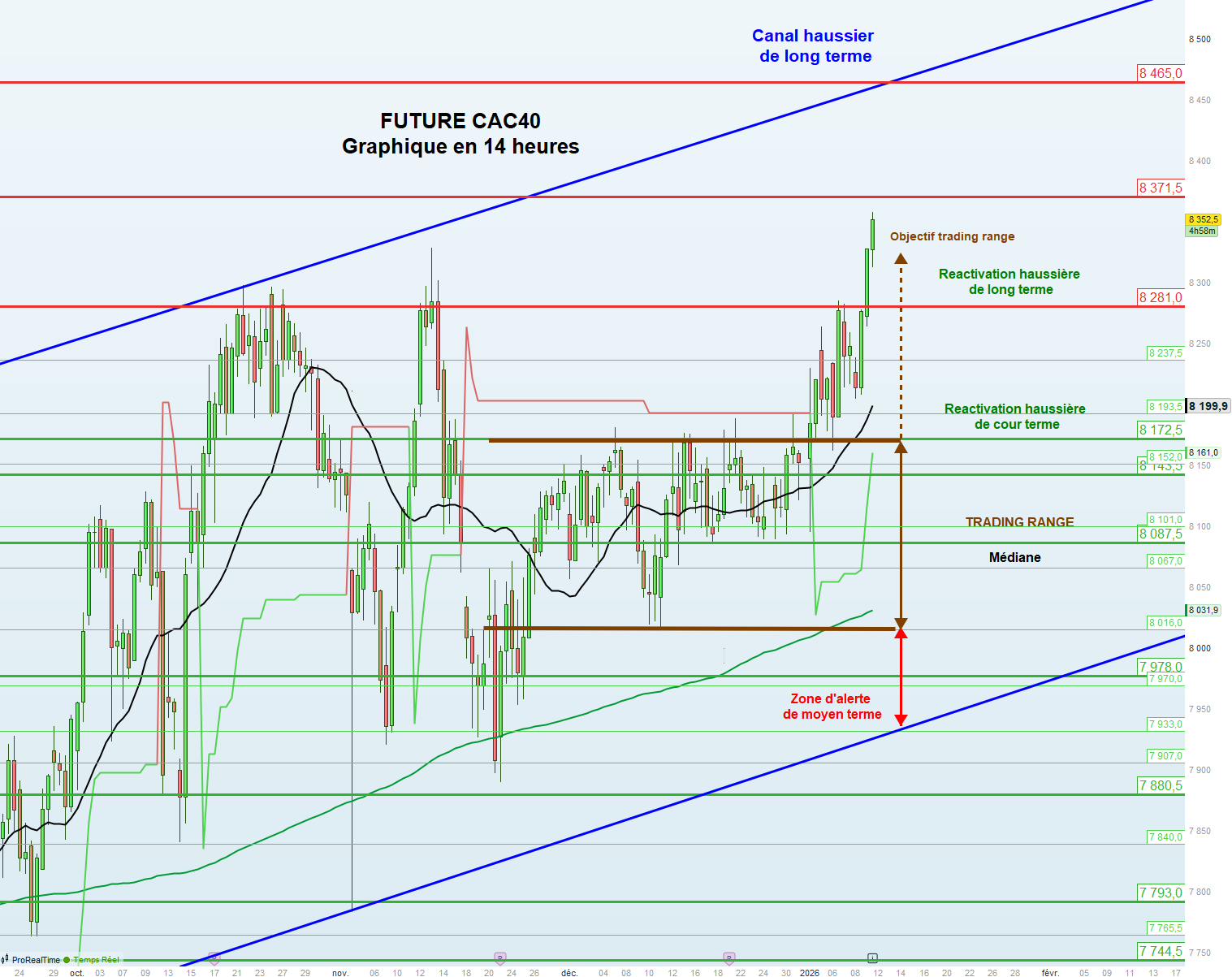 Graphiquement, le Future CAC 40 (cf. graphique en données 14 heures) a franchi le seuil de réactivation haussière de long terme situé à 8 281 points, validant simultanément une extension technique en direction de l’objectif théorique du trading range. Cette progression est intervenue à l’issue d’un throwback maîtrisé sur la borne haute de la zone de congestion au sein de laquelle l’indice avait évolué en phase de consolidation pendant plus d’un mois. Le franchissement net, en clôture, de ce niveau pivot majeur, confirmé sur un minimum de trois séances consécutives, constituerait un signal de réactivation de la dynamique haussière de long terme, ouvrant alors la voie à une poursuite du mouvement en direction de la borne supérieure du canal haussier de long terme, actuellement localisée aux alentours de 8 461 points.