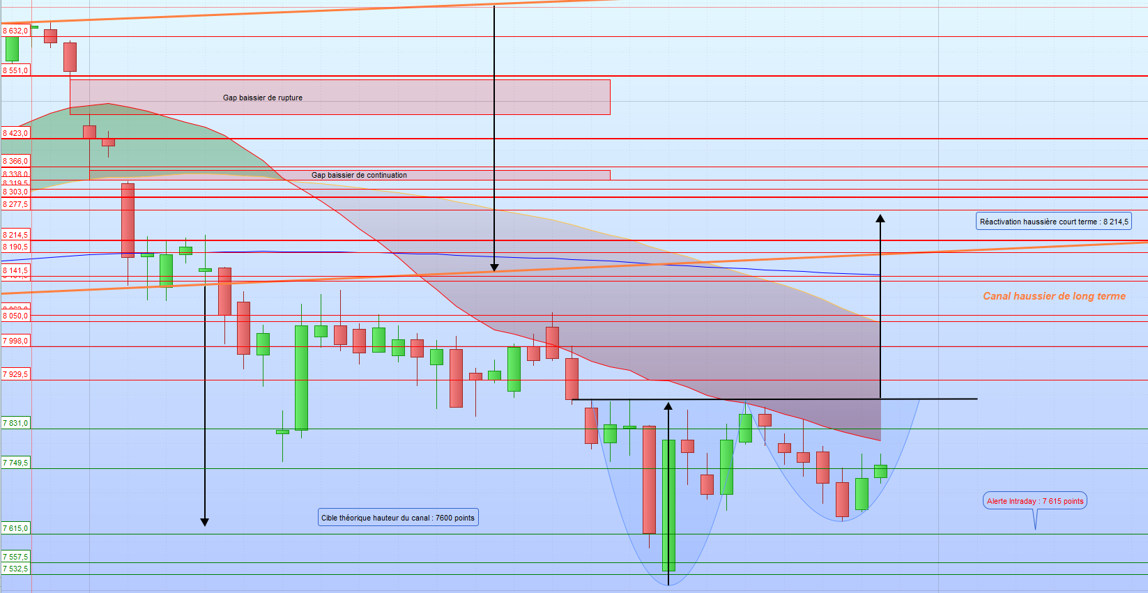 A l’inverse, un affaiblissement du courant acheteur, associé à une cassure sous l’anse de notre figure chartiste, constituerait un premier signal de fragilité à court terme, invalidant le scénario haussier privilégié. Dans ce cas, la correction pourrait se prolonger en direction de la zone des 7 600 points, niveau désormais crédible au regard de la projection de l’ancien canal haussier. Le maintien de ce seuil en clôture apparaît donc déterminant. En cas de rupture, le repli pourrait s’accentuer et ramener l’indice vers ses prochains supports, situés à 7 557,5 puis 7 398,5 points.