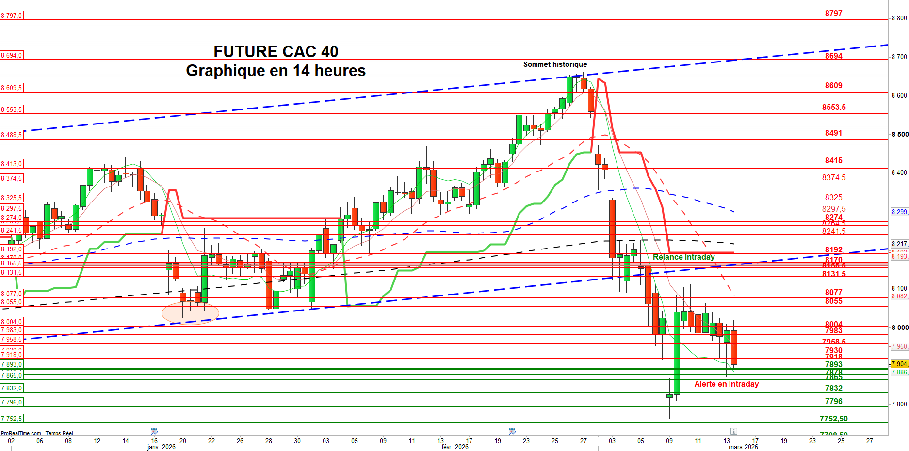 Sous pression en début de séance, l’indice a d’abord enfoncé le point bas de la veille à 7 918 points, puis la zone de support et d’alerte intraday située autour de 7 900 points, avec un point bas à 7 872 points.