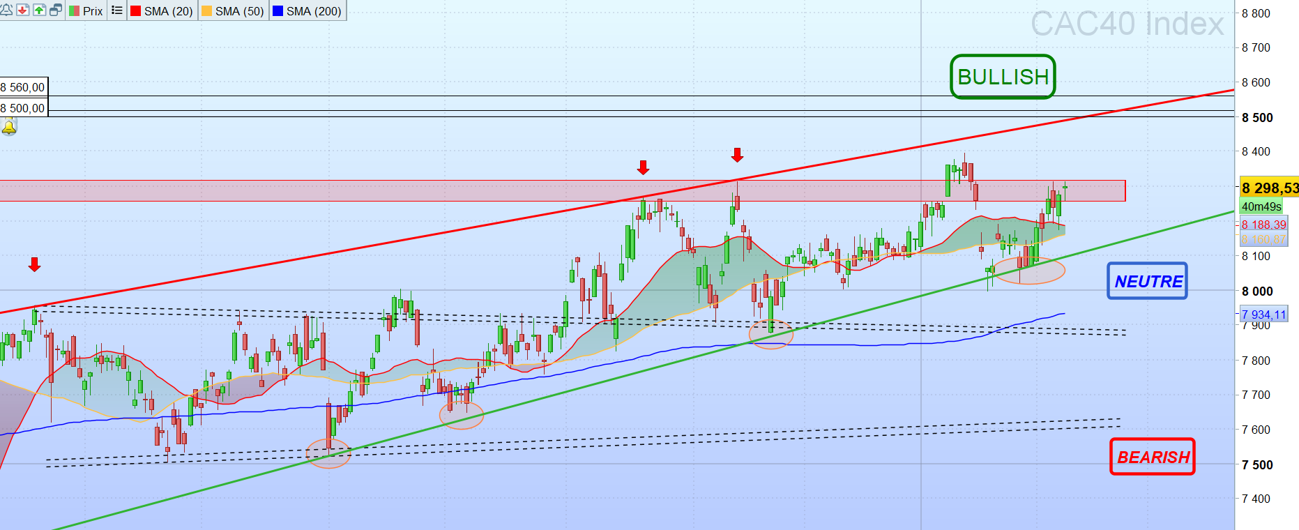 En intraday, le biais est haussier au-dessus de sous 8298 points.