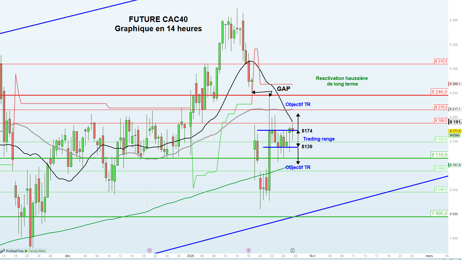 Graphiquement, le Future CAC 40 (cf. graphique en données 14 heures) évolue actuellement au sein d’un range de consolidation délimité entre 8 174 et 8 139 points, après avoir amorcé un rebond significatif au contact de la borne inférieure du canal haussier de long terme. Un franchissement en clôture de la borne haute constituerait un signal précurseur de sortie de consolidation, ouvrant la voie à un objectif technique situé à 8 209 points, obtenu par report de la hauteur de la zone de congestion. En cas de poursuite du mouvement, le comblement du gap laissé ouvert le 19 janvier à 8 252,5 points viendrait valider le mouvement de reprise et réactiver la dynamique haussière de fond en direction des plus hauts historiques. Dans ce contexte, le marché disposerait d’un potentiel vers 8 469,5 points, avant une extension possible en direction de la borne haute du canal, située aux environs de 8 520 points.