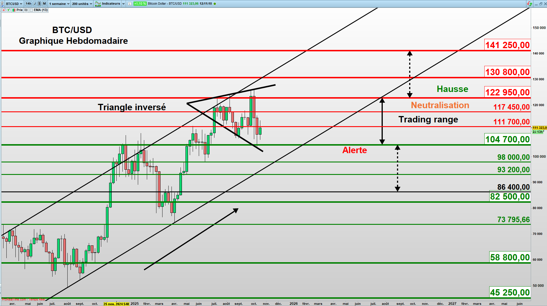 Cependant, depuis la mi-Juillet 2025 on constate la formation d’une structure en Triangle Inversé ou Portevoix, caractérisée par : « Des plus hauts des plus en plus hauts et des plus bas de plus en plus bas », qui en haut de marché traduit une certaine désorientation. On attribue ce phénomène au fait que des mains fortes allègent leurs positions puis enlèvent la pression baissière, laissant les mains faibles repayer et faire rebondir l’actif, avant de replacer des ordres de vente. Or, cette structure est très fréquemment annonciatrice d’un mouvement baissier plus marqué. Cependant, ses bornes mal définies rendent difficile le calcul d’une cible baissière.