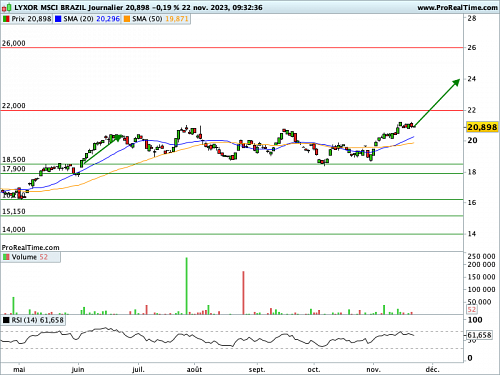 Au regard des éléments graphiques mentionnés, l'équipe de BFM Bourse propose aux investisseurs actifs de prendre position à l'achat sur le tracker LYXOR ETF IBOVESPA, au cours actuel, avec les 26.0000 € dans le viseur. Un stop de protection devra être placé à 19.0000 €.