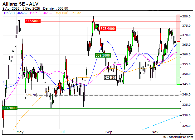 Le titre Allianz SE présente une configuration positive sur le court terme au-dessus du support des 359.3 EUR. La zone de résistance des 373.4 pourrait toutefois engendrer quelques prises de bénéfices après la hausse de ces dernières séances.