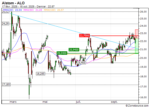 Le titre est en situation de surachat, à proximité d'une résistance court terme située à 22.7 EUR. Le timing est adéquat pour se placer vendeur sur Alstom en anticipant des prises de bénéfices en direction des 20.5 EUR.