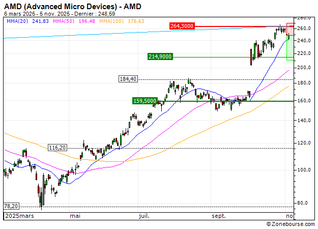Le titre AMD (Advanced Micro Devices) montre actuellement quelques signes d'essoufflement au contact des 264.33 USD et pourrait amorcer une nouvelle phase de consolidation dans les séances à venir. en direction des 210 USD.