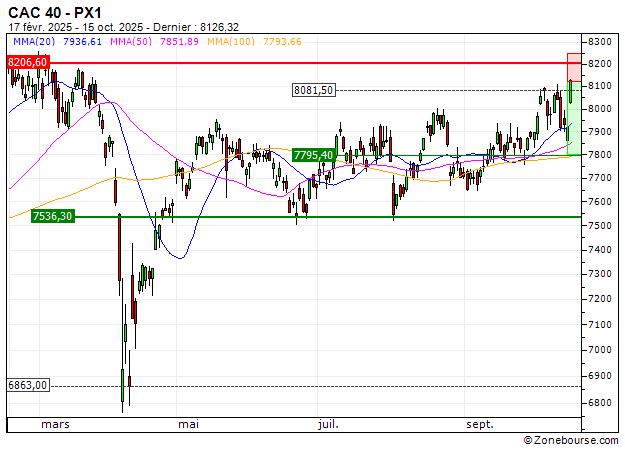 La reprise technique dernièrement observée sur le CAC 40 devrait trouver un point d'arrêt dans la zone de cours actuelle. Le timing apparaît pertinent pour anticiper le retour d'une dynamique baissière, avec les 7800 points comme principal objectif, zone de convergence avec la moyenne mobile à 100 jours.