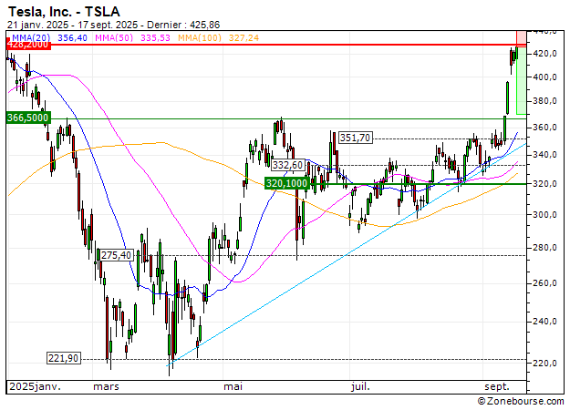 La valeur Tesla, Inc. est, en effet, en zone de surachat et la proximité du niveau actuellement testé confère un timing intéressant pour mettre à profit une correction technique dans les séances à venir en direction des 370 USD.